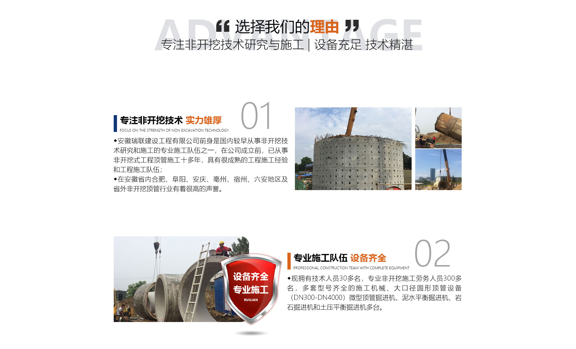 安徽瑞聯建設工程有限公司前身是國內較早從事非開挖技術研究和施工的施工隊伍之一,在公司成立前,已從事非開挖式工程頂管施工十多年,具有很成熟的工程施工經驗和工程施工隊伍,在安徽省內合肥、阜陽、安慶、亳州、宿州、六安地區及省外非開挖頂管行業有著很高的聲譽。面對日益擴大的市場,公司于2014年正式成立,公司擁有勞務分包及市政公用工程總承包資質。公司優勢(文字):現擁有中高技術人員30多名,非開挖施工勞務人員300...